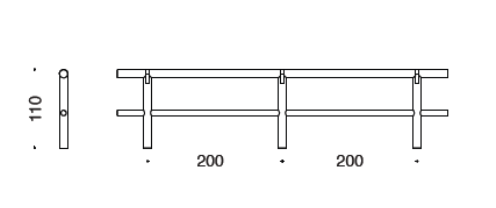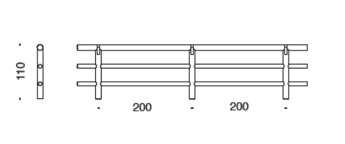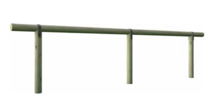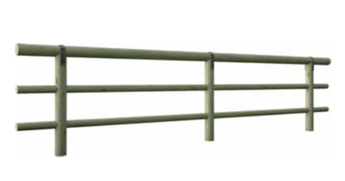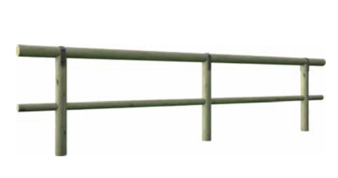 Corrimano in tondello cilindrico con diametro cm 12 ed uno o due correnti orizzontali in tondello con diametro cm 8 e lunghezza cm 200, fissati ai piantoni per mezzo di viteria in acciaio zincato.