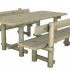 È una simpatica composizione realizzata combinando elementi tondi per le strutture portanti, del diametro di 80 e 100 mm, ed elementi rettangolari per il piano del tavolo, le sedute e lo schienale con uno spessore di ben 45 mm, in legno di pino silvestre impregnato in autoclave.